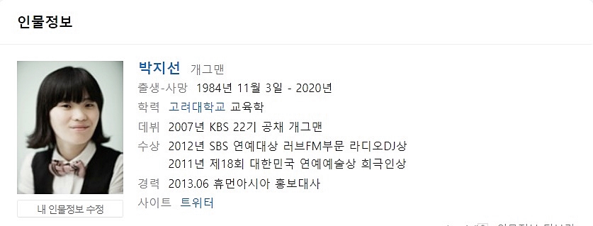 고려대 교육학과 출신인 박씨는 2007년 KBS 22기 공채 개그맨으로 데뷔했고, 이후 다재다능한 모습으로 연예계에서 승승장구했다. KBS 연예대상 코미디부문에서 데뷔 첫해 신인상을 시작으로 2008년 우수상, 2010년 최우수상을 받았다. 라디오 DJ로도 활동했고, 2012년에는 라디오 DJ 자격으로 SBS 연예대상을 받았다. 부디 하늘나라에서는 행복했으면 합니다.