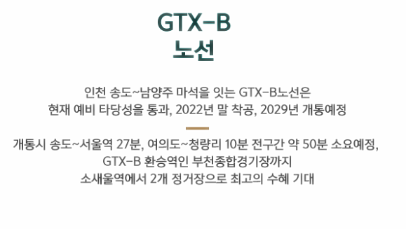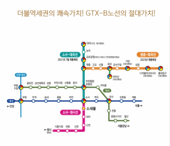 2022년 말 착공예정인 수도권 광역급행철도 GTX-B 노선의 수혜지이기도 하다. GTX-B 노선은 현재 예비 타당성을 통과한 상태다. 이 노선 개통시 송도-서울역 27분, 여의도-청량리 10분으로 단축되며 부천운동장역이 환승역 예정이라 초대형 교통개발호재까지 기대되는 곳이다. 서울외곽순환도로 시흥IC도 빠르게 이용할 수 있다.