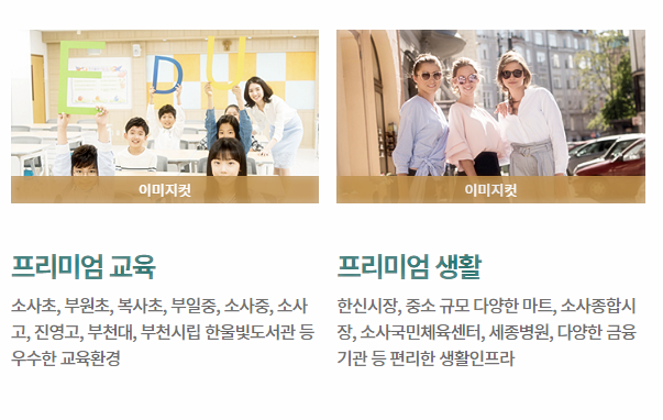 우선 우수한 교육환경을 자랑한다. 도보거리에 소사초가 위치하며 부원초, 복사초, 부일중, 소사중, 소사고, 진영고, 부천대, 부천시립 한울빛도서관 등이 인접해 있어 아이들 교육이 안심이다.