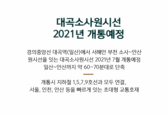 소새울역 역세권일 뿐 아니라 인근 교통호재에 대한 기대도 매우 높은 곳이다. 먼저 대곡소사원시선이 2021년 개통을 앞두고 있다. 교통호재 덕분에 큰 프리미엄이 예상되는 단지가 있으니 아래에서 확이해 보세요.