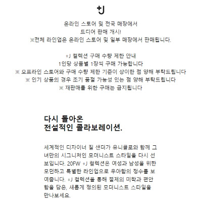 유니클로는 이날 공식 온라인 스토어와 명동중앙점, 롯데월드몰점, 신사점 등 서울 매장 3곳, 현대백화점 판교점, 대구 신세계점, 부산 삼정타워점 등 지방 매장 3곳에서 +J 켈렉션 판매를 시작했다. 보다 자세한 내용은 아래를 참고하세요!