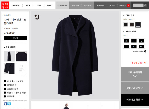 +J캐시미어블렌드노칼라코트 품절 안내가 되어 있다. (사진=유니클로 홈페이지 캡쳐)