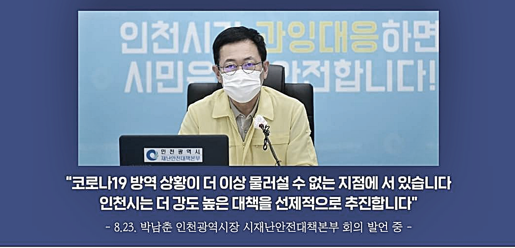 인천시(시장 박남춘)는 지역 내 코로나19 확진자 증가 추세가 심각한 위기상황에 이르렀다는 판단 아래 현 사회적 거리두기 2단계 대책보다 강도높은 대책을 시행합니다.