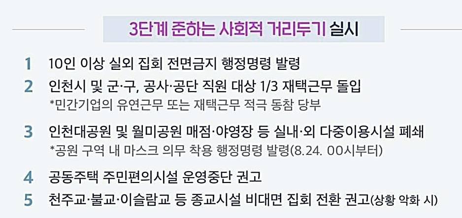 인천시는 서울·경기지역에만 사회적 거리두기 2단계로 격상됐던 16일에도 자체적으로 2단계에 준하는 방역대책을 추진해 왔다. 19일 수도권 전역이 사회적 거리두기 2단계로 격상된 후에는 실내 50인 이상, 실외 100인 이상의 대면 집합·모임·행사를 전면 금지하고, 12종의 고위험시설과 월미바다열차를 비롯한 실내 국공립시설의 운영을 중단시키고, 다중이용시설의 방역수칙 준수 의무화도 계속 유지하고 있다. 자세한 내용은 아래를 참고해주세요!!