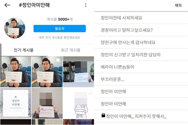 왼쪽부터 '정인아 미안해' 챌린지, 서울양천경찰서 '칭찬합시다' 게시판./사진=인스타그램, 양천경찰서 홈페이지
