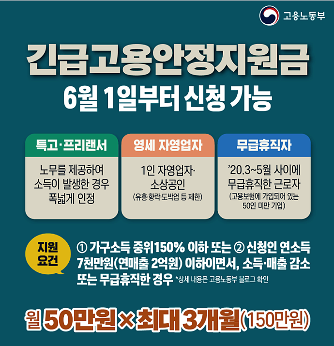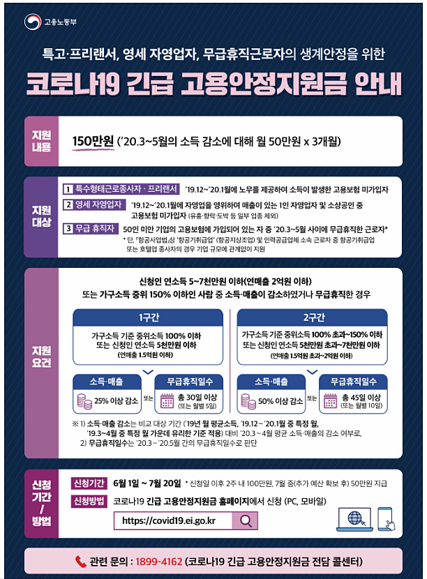 코로나19로 인해 소득·매출이 감소하였음에도 고용보험의 보호를 받지 못한 취약계층의 생계안정을 도모하기 위해 고용부가 2020년 5월 18일 발표한 현금 지원 정책입니다. 지원대상은 코로나19로 인해 2020년 3~4월 사이에 소득매출이 감소한 일정 소득 이하의 특고·프리랜서 및 영세 자영업자와 2020년 3~5월 사이에 무급휴직한 근로자이다. 긴급 고용안정지원금에 대해서 아래에서 확인해 보도록 하겠습니다.