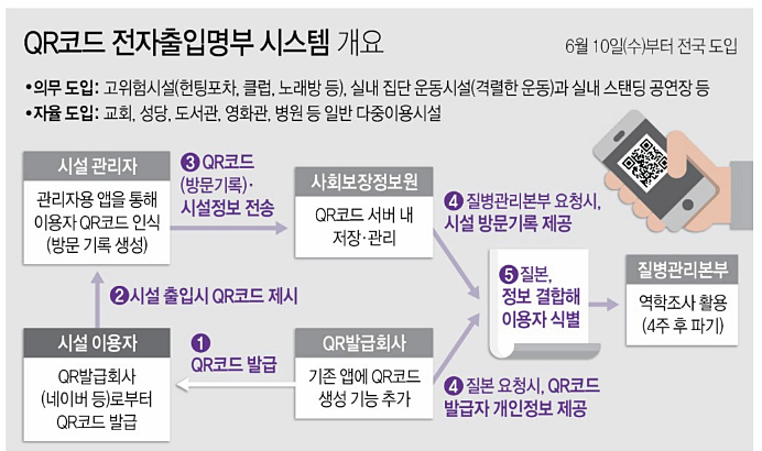 전자출입명부가 도입돼 이용자는 고위험시설 이용 시 개인별 암호화된 1회용 QR코드를 발급받아 시설관리자에게 제시해야 합니다. 시설관리자는 이용자가 제시한 QR코드를 별도 앱을 통해 스캔하고, 스캔된 정보는 공공기관인 사회보장정보원으로 자동 전송합니다. 아주 간단한 시스템으로 보안도 지키고 우리의 건강도 지키는 1석2조의 정책입니다.
